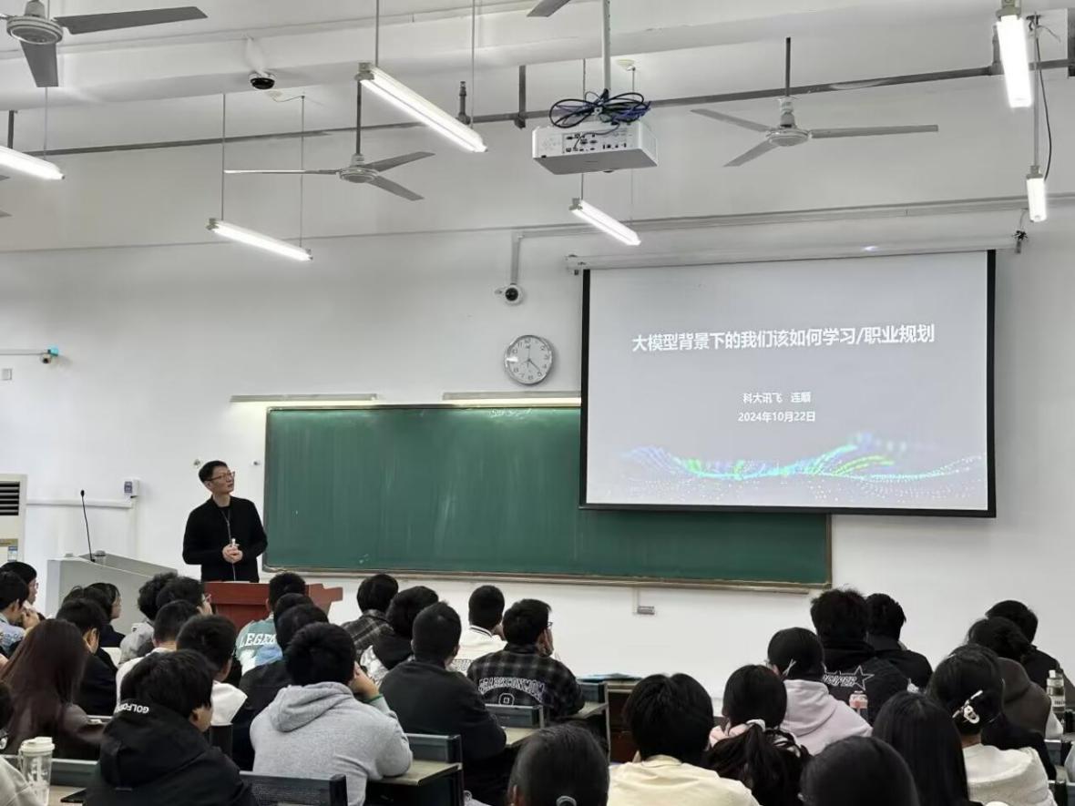 10月20日,科大讯飞教育发展有限公司总监连顺做了《大模型背景下的我们该如何学习/职业规划》的专题报告,连总首先对大模型的原理及技术进行了深入浅出的介绍,向学生展示了目前最新AI研究成果,然后介绍了前沿技术发展趋势及行业应用,最后对在大模型时代下学生四年的规划提出了宝贵意见。