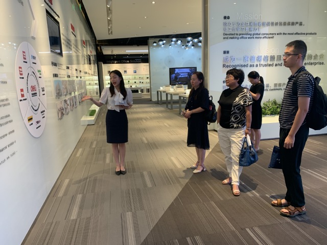 调研组在校招负责人邵莎莎的带领下先后参观了得力集团的虚拟展厅、办公园区、生产车间、公司食堂。得力集团讲解员对企业基本情况、智能办公领域、产品类型、发展前景、合作伙伴等方面进行了介绍。