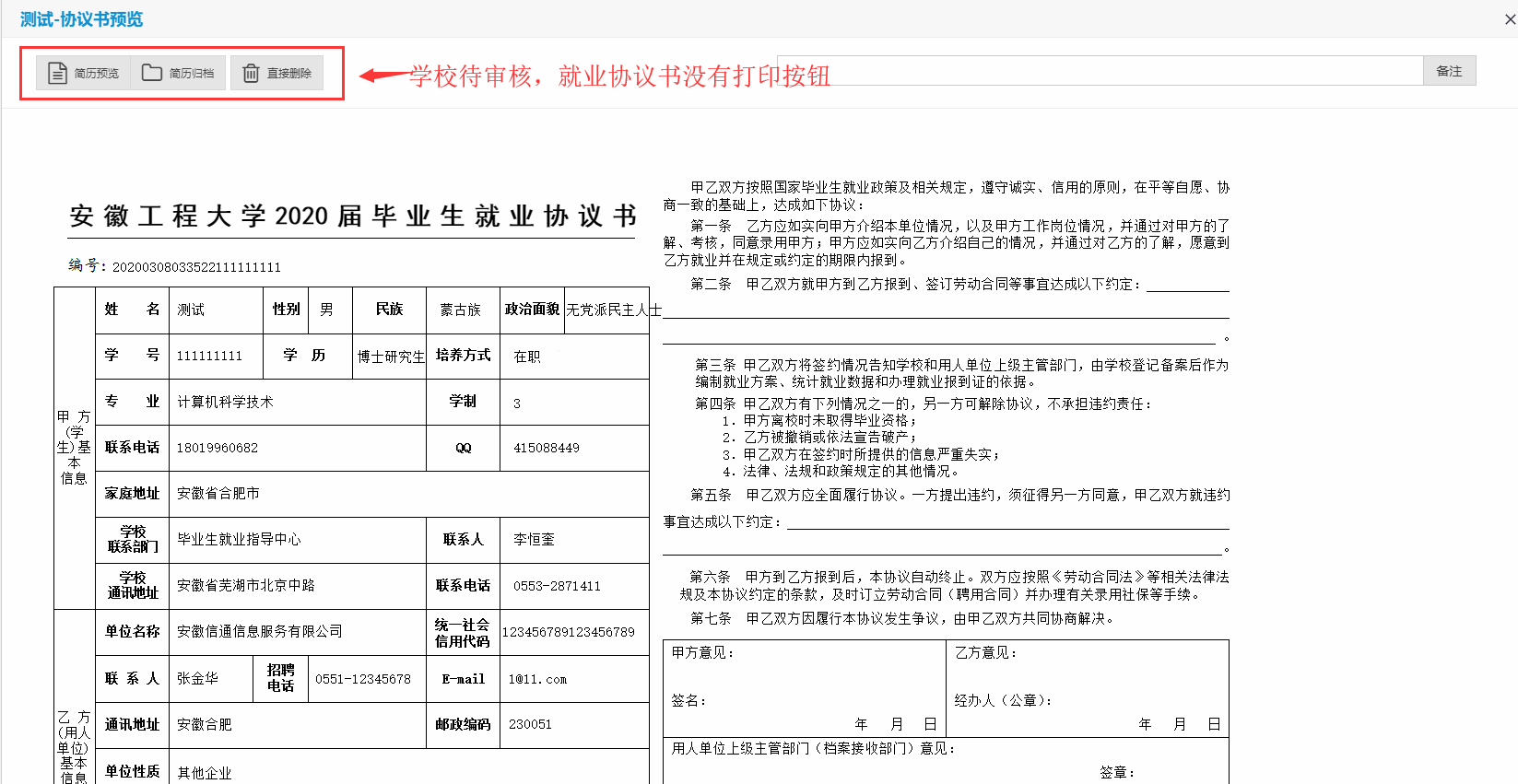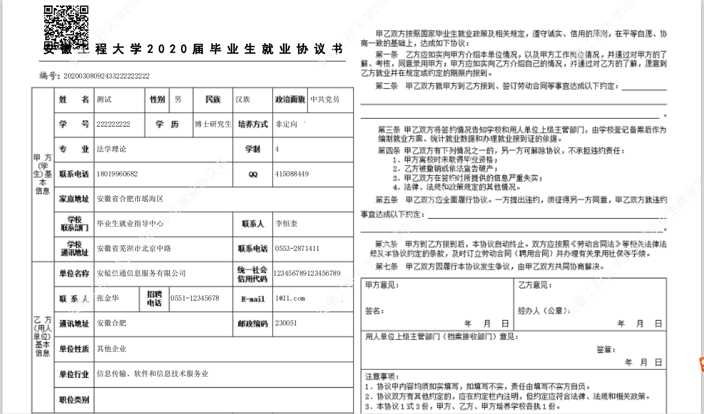 协议书默认打印3份(用人单位1份、毕业生1份、学校1份)。协议书打印完毕后,交给用人单位或毕业生,进行盖章签字后生效。(若毕业生在外地,可自行安装一个PDF打印机,打印成PDF文件,以便进行网上传输; 或打印出来后,扫描后传输)。 备注:审核通过后,用人单位亦可自行打印。 每份协议书附防伪二维码。