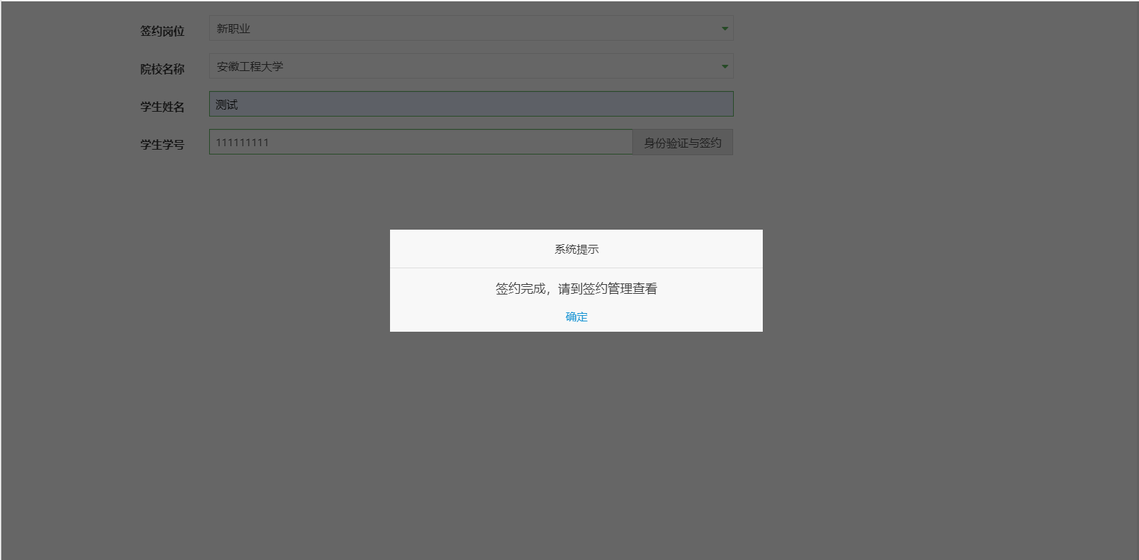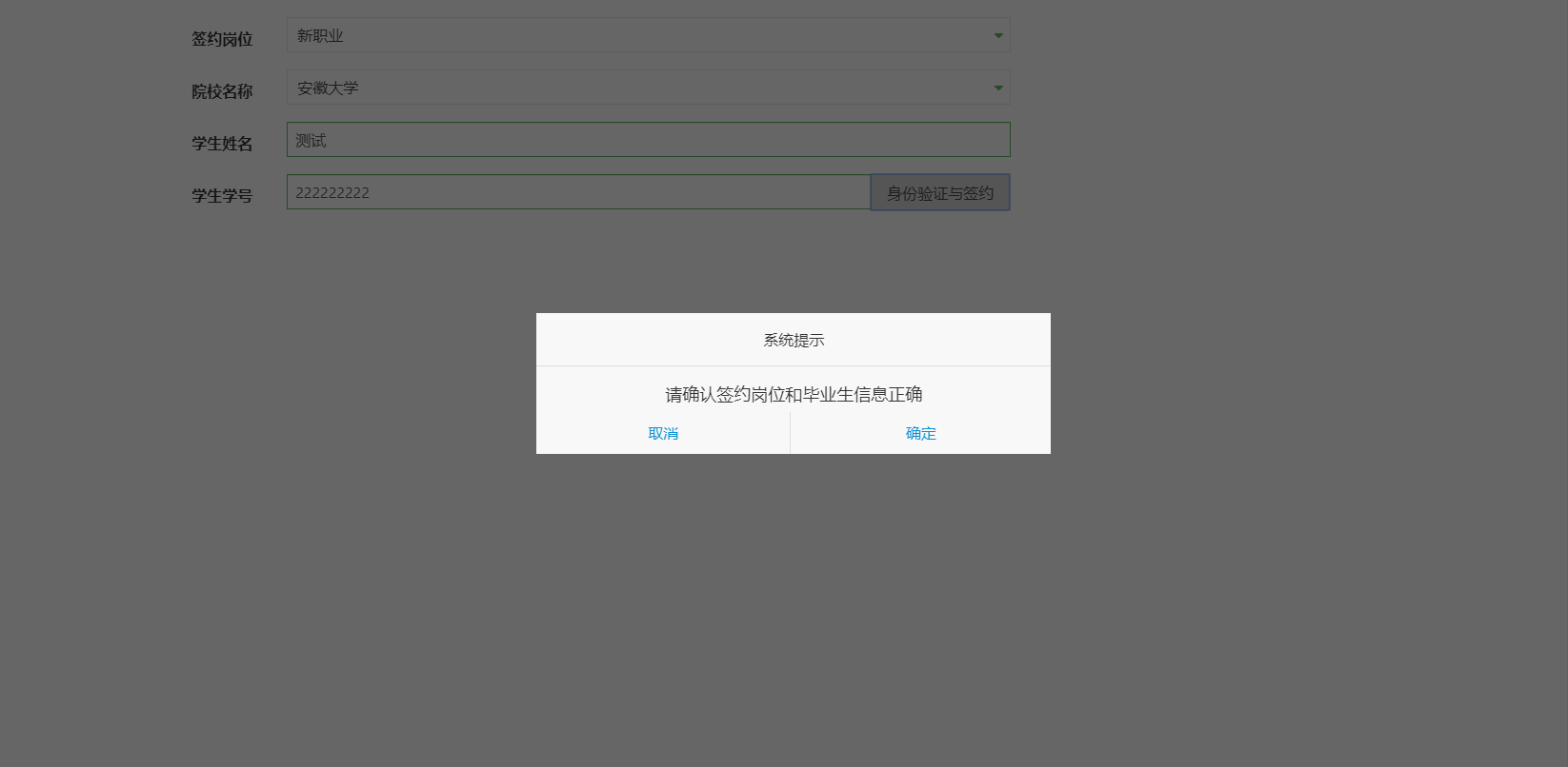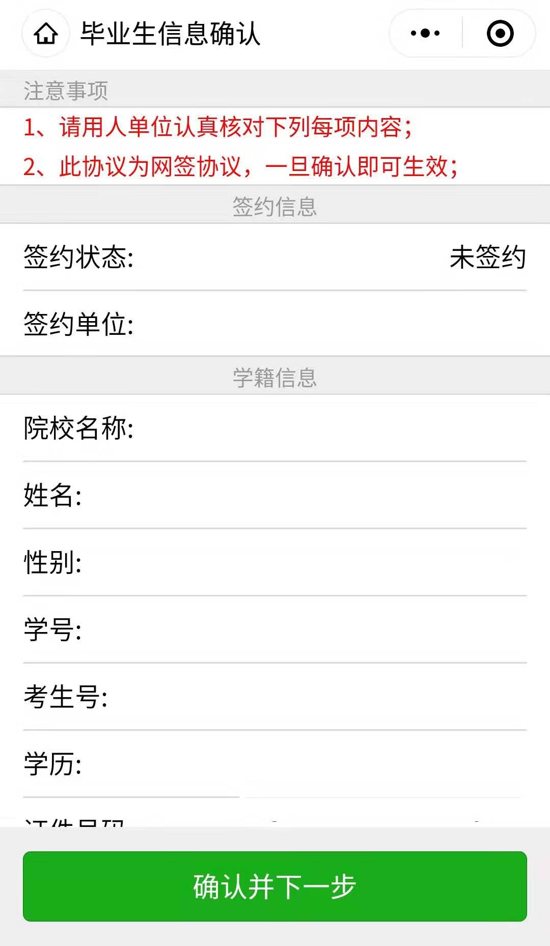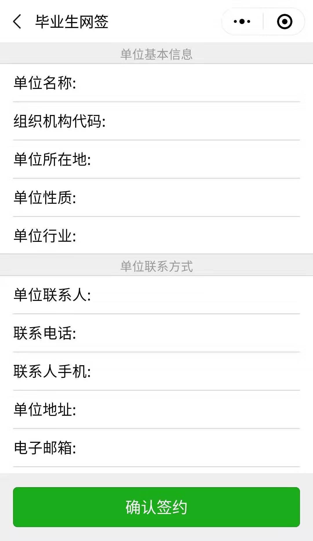 第二步、用人单位打开微信,使用扫一扫功能,扫码后,会出现填写签约信息页面;用人单位首先验证毕业生信息,确认下一步后,填写本单位基本信息和联系方式,并选择签约毕业生的工作岗位,然后点击“确认签约”后提交。 备注:若毕业生已经在系统中已经就业,需提交解约申请或管理员后台解锁处理(设置毕业去向为待就业)。