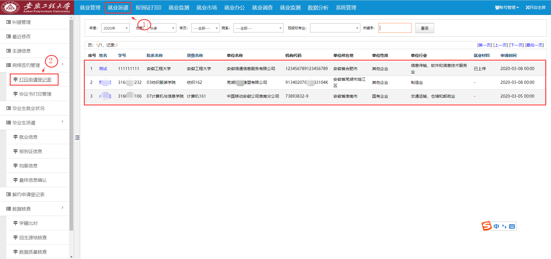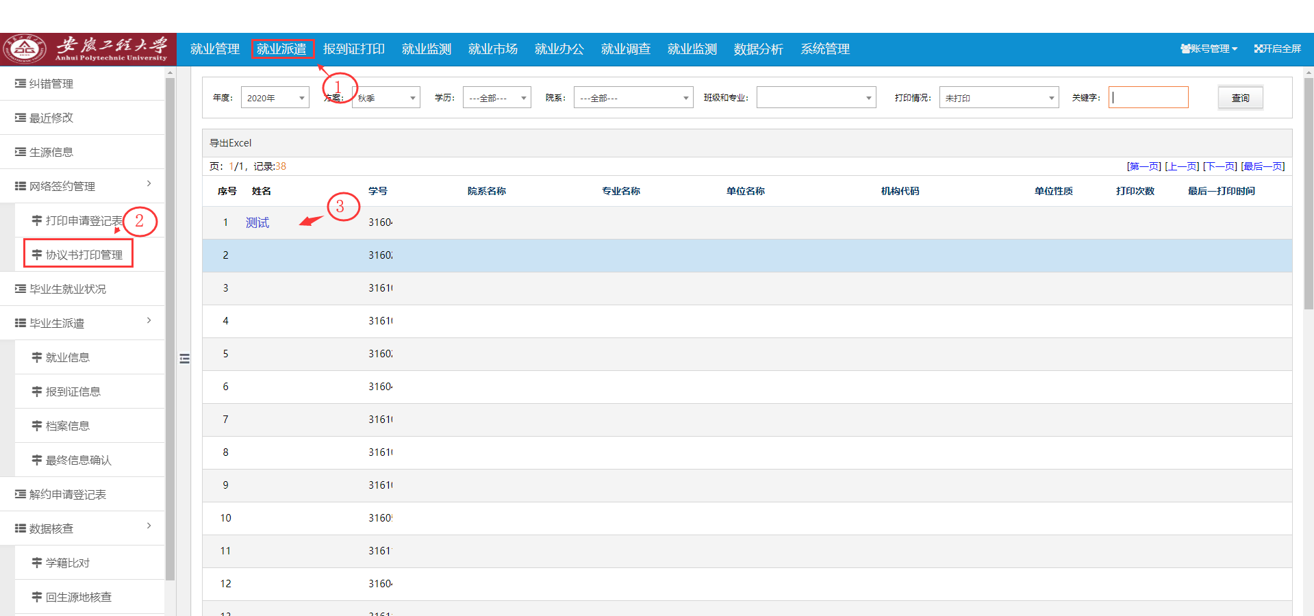 审核后的数据自动转入“协议书打印管理”模块,再点击学生姓名,进入打印页面,即可在线打印“协议书”。 第一步、院系老师和管理员打开协议书打印管理页面