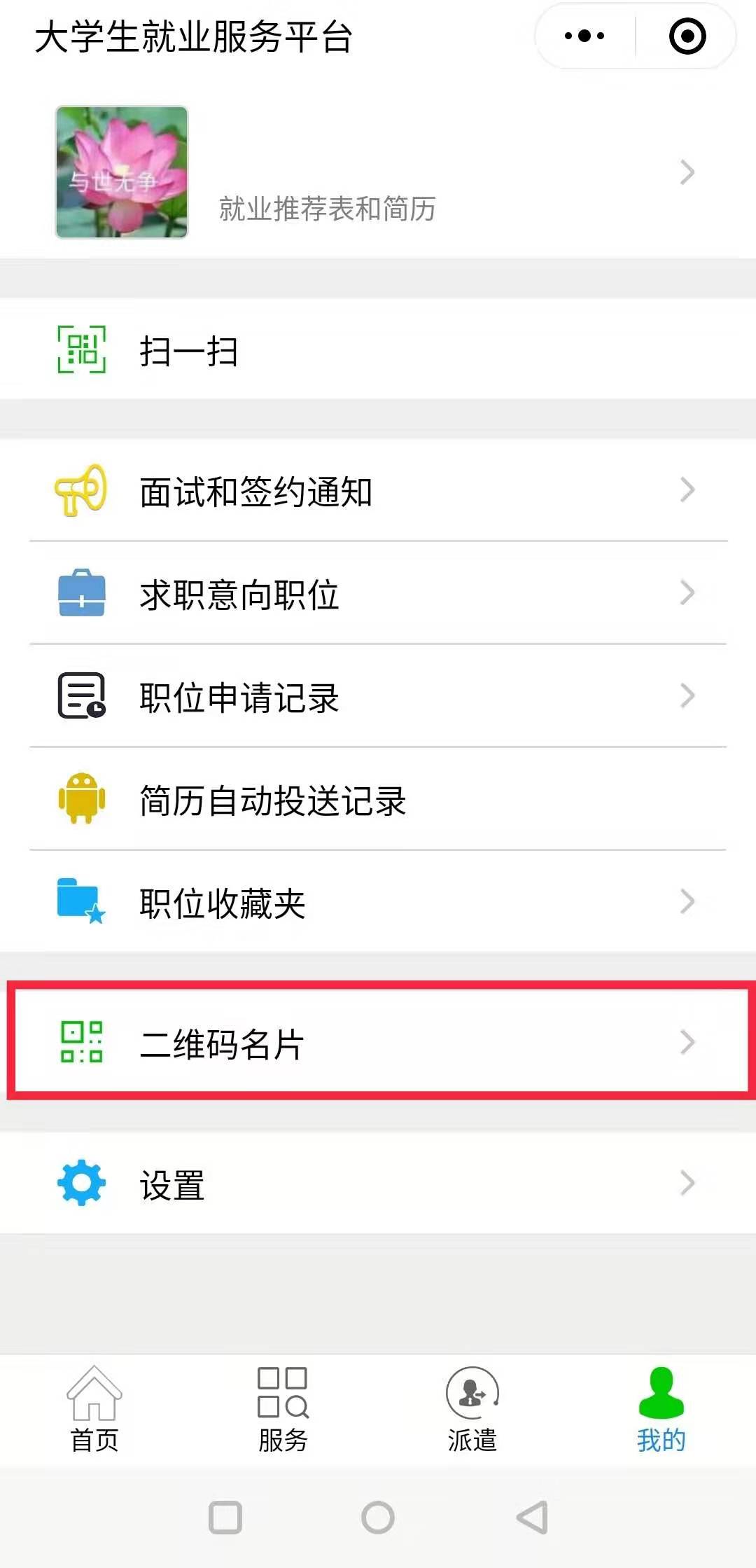第一步、毕业生在“我的”中打开“二维码名片”,向用人单位招聘人员发送二维码,并告知使用微信扫描二维码。 备注:在签约前请务必在“派遣”“生源信息维护”确认信息与本人信息完全一致,否则不能签约。