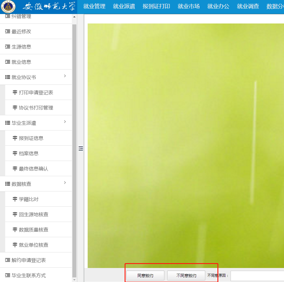第二步、辅导员进入系统,点击上方“就业派遣”,再点击左下角“解约申请登记表”,点击申请学生姓名,进入审核页,点击“同意毁约”或“不同意毁约”即可。 解约时,应认真查看原协议书的内容和提交的解约材料,对于合理的诉求应予以坚决支持,要维护协议书的严肃性。