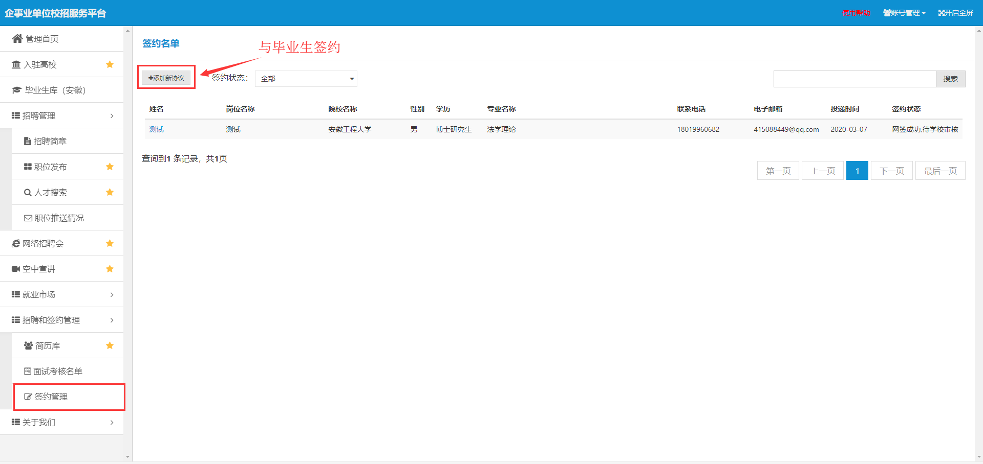 第一步、用人单位登录校招平台 第二步、用人单位打开签约管理模块