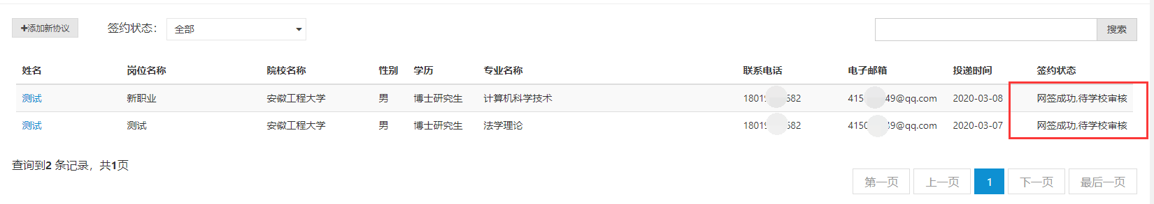 签约成功后,签约状态为“签约成功,待学校审核”,就业协议书不能打印。