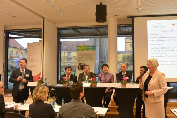 校长对话环节由奥斯纳布吕克应用科学大学副校长萨宾娜·艾格斯教授和合肥学院党委书记蔡敬民教授共同主持。施特拉尔松德应用科技大学前校长法尔克·霍恩教授,安哈尔特应用科学大学校长约尔克·巴格丹教授,常熟理工学院校长江作军教授,昆明学院校长黎素梅教授,佛山科学技术学院党委书记曾峥教授参加了对话。参加对话的校长们首先对各自高校进行了简单介绍,然后就创新创业教育和高校对创业支持展开了热烈的讨论和经验交流。