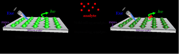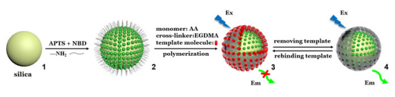 In this paper, it is mentioned that the synthesized SiO2@MIPs forms a microsensor array on the regular dot array of etched silicon wafers by self-assembled technique, and four heavy metal ions, whose LOD concentration is 10−9 mol·L−1, enter the nanostructured shell-layer with fluorescence-tagged recognition site driven by concentration differences. The recognition sites have highly selective recognition of heavy metal ions with sensitive responses. Based on FRET principle, ultra-trace detection of the target analytes can be achieved, which solves the problem of identification and detection of polymetallic ions.