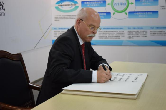 Dr. Clemens von Goetze, German Ambassador to China, visits HFU on July 8, 2019. Dr. Cai Jingmin, Chair of HFU Council and Dr. Wang Qidong, President of HFU, warmly welcome him and his delegation.