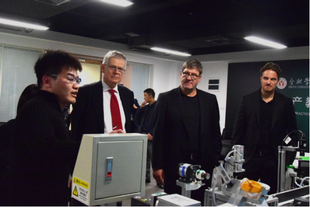 After the opening ceremony, Mr. Linde and his delegation visited the achievements exhibition of Sino-German education cooperation and the internship training and research and development center of HFU Volkswagen College.
