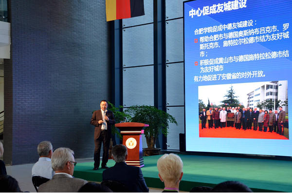 On behalfHFU,professorCaiJingmin,Chair ofHFU Council,extends hiswelcome to the delegation. In his speech,takingHFU as oneco-built by China and Germany, professorCai sharesHFU’s achievements andintroducesAnhui-German Center of the university. He points out that by learning from the German undergraduate applied talentcultivation system,HFU innovates its educational system in practice, andhasfound its own development mechanism by reconstructing the competence-oriented discipline systems andsetting modular courses. In terms of Anhui-German Center, he claims that since its foundation, the center has been playing its part in Anhui’s international image establishment and the cooperation and exchanges between China and Germany.