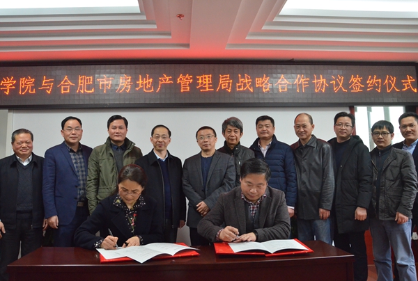 为发挥高校和行业管理部门各自优势,提高市场监测分析水平,建立完善房地产宏观调控机制,3月22日,合肥学院与合肥市房地产管理局签订战略合作协议。合肥市房地产局党组书记、局长许道和,副局长宣圣进,合肥学院党委委员、纪委书记洪家友,副校长陈秀等参加签约仪式。合肥学院教务处处长王晓峰、经济系主任陈江华、合肥学院房地产研究所所长朱德开、合肥学院房地产研究所副所长凌斌等参会。