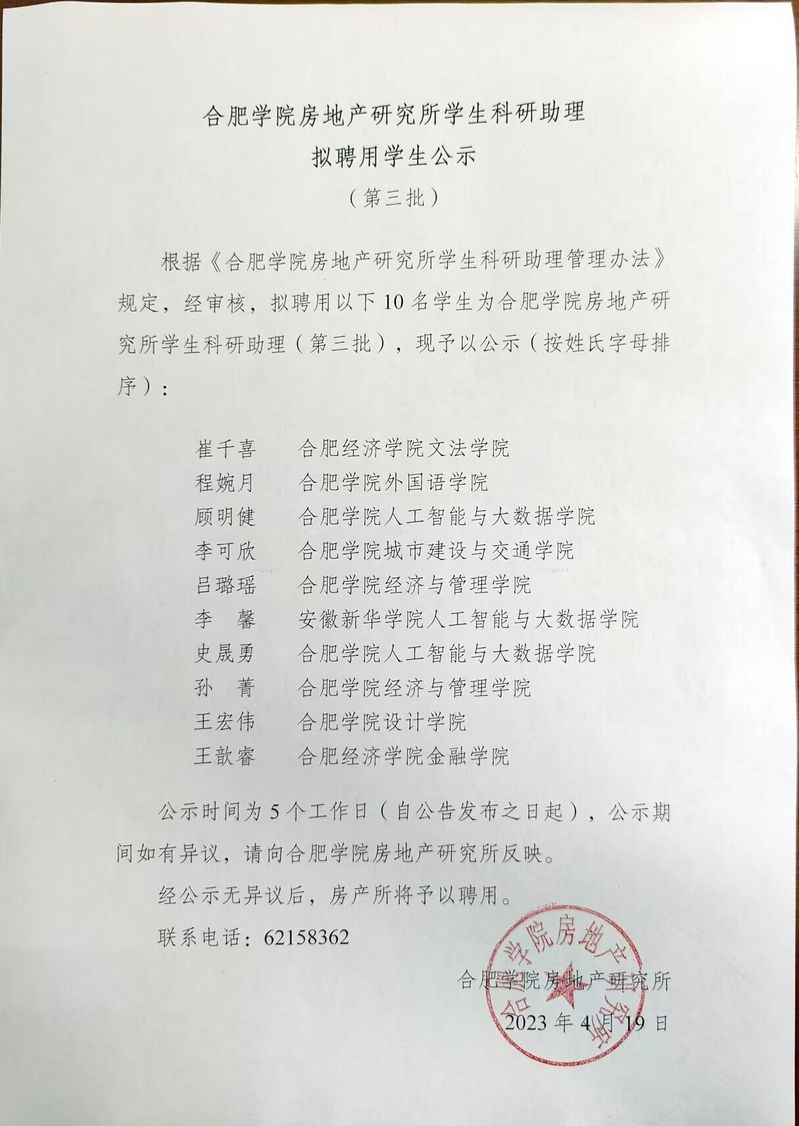 合肥学院房地产研究所学生科研助理(第三批)拟聘用学生公示