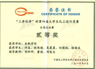 | 2 | “三井化学杯” 第四届大学生 化工设计竞赛 | 赛区 | 一等奖 | 1 | 许忍 张陈超 吴晨晨 刘国强 徐德成 | 胡科研 董强 刘俊生 |