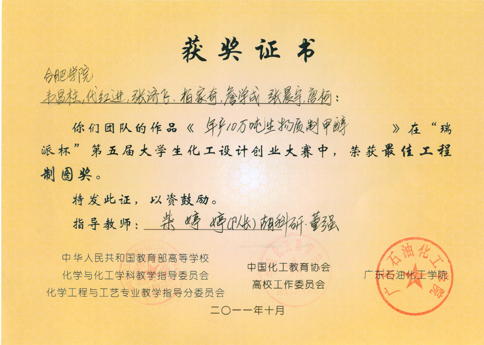| 2 | “三井化学杯” 第五届大学生 化工设计竞赛 | 赛区 | 一等奖 | 1 | 舒秀芬 刘娇龙 唐柯张济飞韦昌柱 | 胡科研 邵国泉董强 |