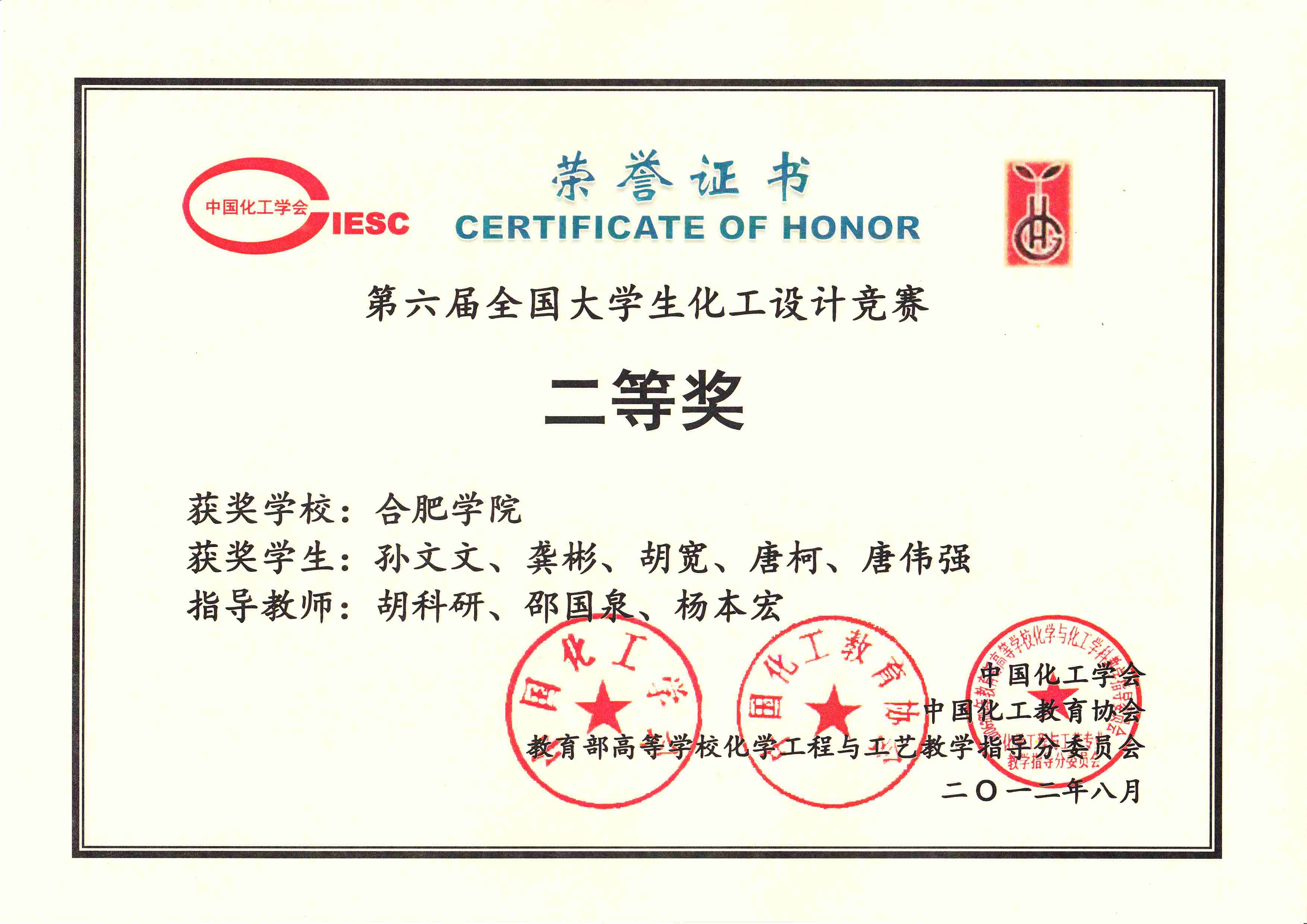 | 1 | “中国石化-三井化学杯” 第六届全国大学生 化工设计竞赛 | 赛区 | 一等奖 | 1 | 孙文文队员:唐伟强、唐柯、龚彬、胡宽 | 胡科研、邵国泉、杨本宏 |