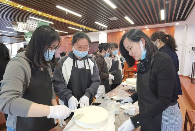 此次活动邀请了专业烘焙老师现场教学,活动一开始烘焙老师向大家讲解相关烘焙知识和制作步骤,还熟练的进行了操作演示。大家仔细倾听,认真揣摩,熟悉材料和用具后,在烘焙老师的耐心指导下,开始动手做起了春日感满满的“柚见云霞”蛋糕。抹奶油、放水果装饰,步骤娴熟、手艺精湛,活动现场阵阵欢声笑语,大家体验着自己动手DIY的制作乐趣,分享着温馨甜蜜的烘焙时光。