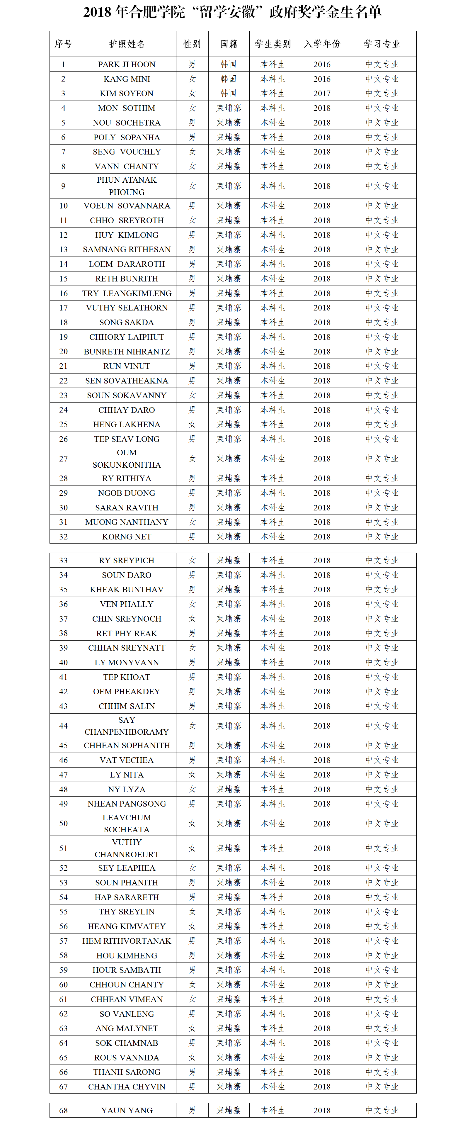 根据安徽省教育厅印发的《留学安徽计划》和《安徽省外国留学生奖学金管理暂行办法》的文件要求及布置,按照我校《合肥学院国际学生奖学金评选管理办法(试行)》的文件规定,我校奖学金认定小组对2018年度“留学安徽”政府奖学金生进行评审申报工作。经评审,决定推荐PARK JI HOON等68名在读国际学生为2018年度“留学安徽”政府奖学金生并上报备案。