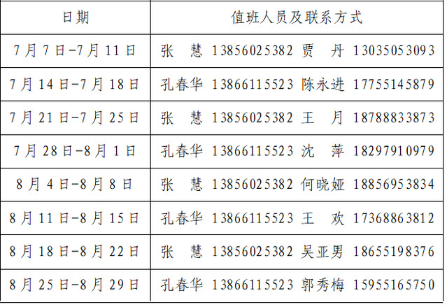 二、暑期安排值班,请各科室根据工作分工和学校重点工作合理安排时间,抓好文件修订、中央八项规定精神学习、对外合作交流等重点工作落实。
