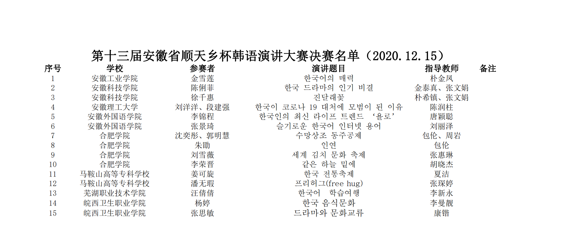 第十三届安徽省顺天乡杯韩语演讲大赛决赛名单(2020.12.15)