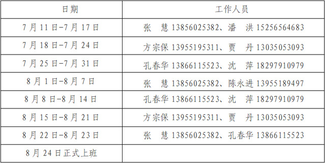 暑期实行轮休工作制,请大家根据工作分工和学校重点工作合理安排时间,对于异常情况及时上报,具体排班表如下: