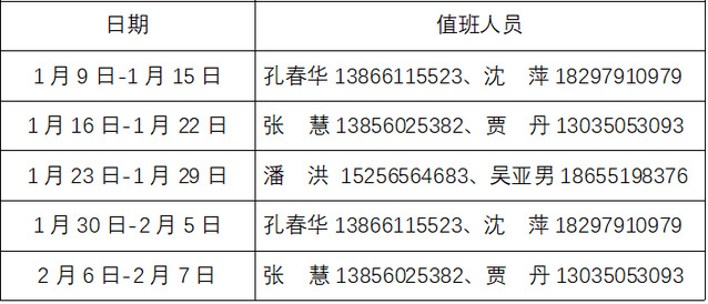 三、寒假期间安排值班,请各科室根据工作分工和学校重点工作合理安排时间 ,遇有突发事件,要按规定及时报告并妥善处置,确保学校安全稳定,具体排班表如下: