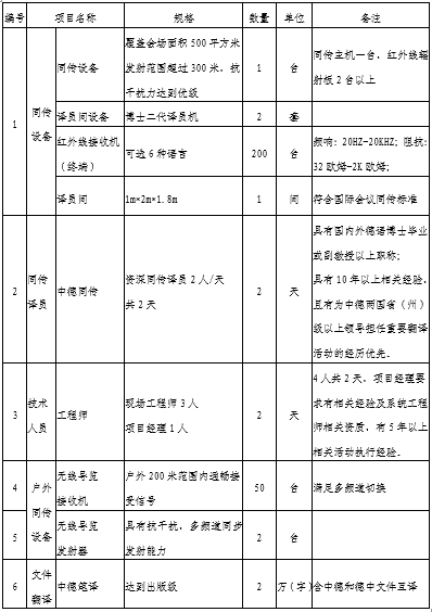 1)提供活动中同声传译保障服务(包含同传设备线下200人、中德同传译员2人等);