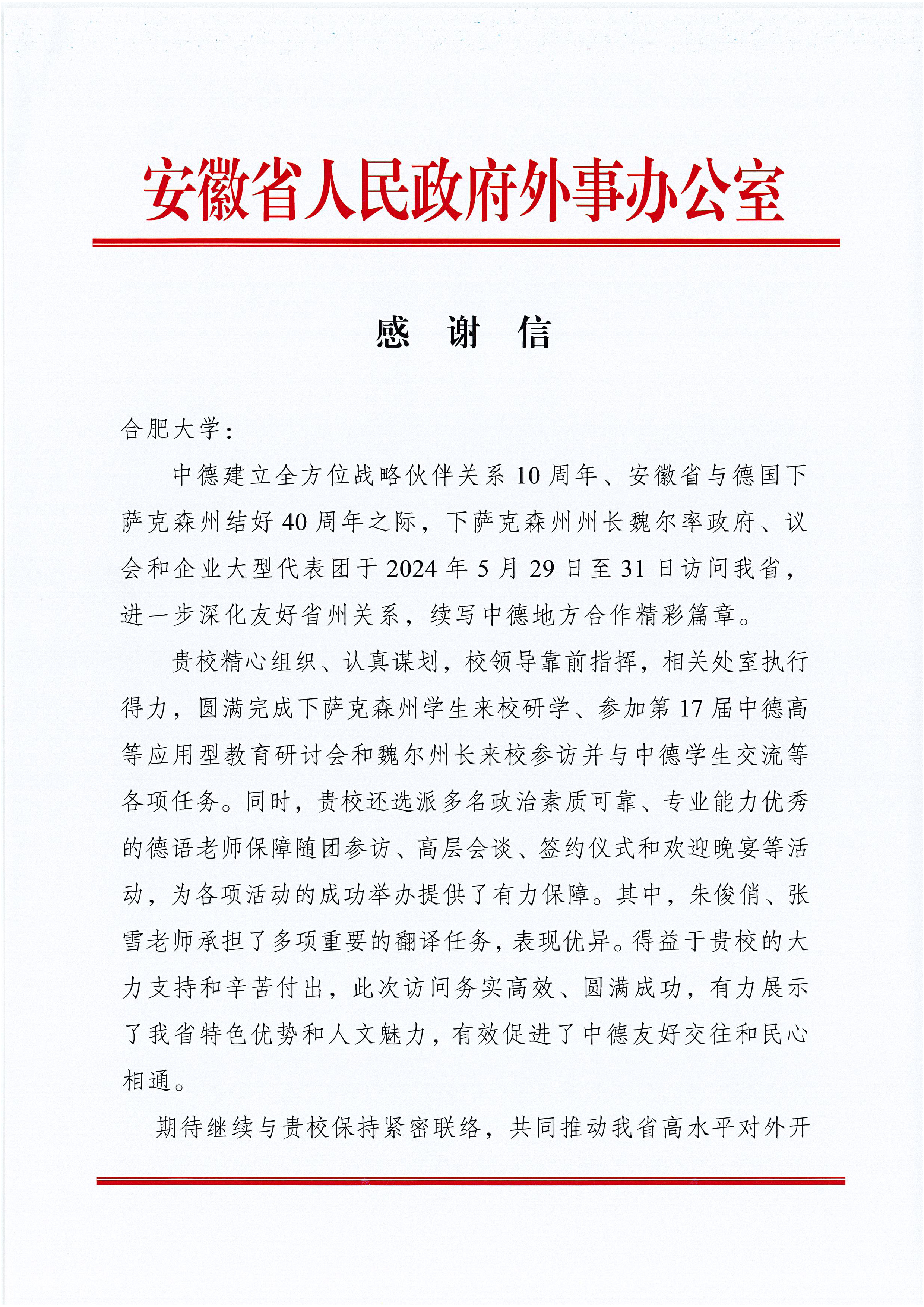 信中表示,在安徽省与下萨克森州结好40周年之际,下萨克森州州长代表团近期访问我省。在省委、省政府的坚强领导和安徽省外办的有力指导下,我校圆满完成各项任务,进一步深化友好省州关系,续写中德地方合作精彩篇章。