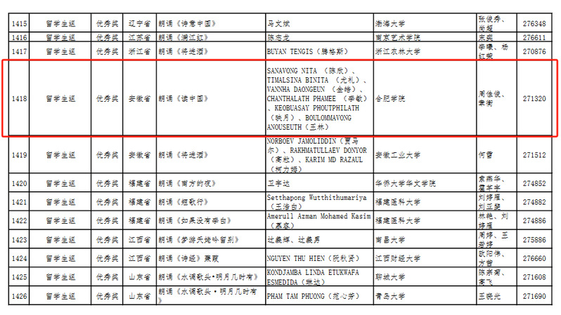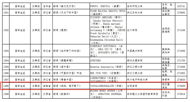 近日,中华经典诵写讲大赛执委会公布第五届中华经典诵写讲大赛“诵读中国”经典诵读大赛获奖名单,我校留学生喜获佳绩。由苏敏(AVANNALATH SOUDALATH)同学个人诵读的作品《妈妈,稻子熟了》(指导老师:胡双露、周冉)荣获全国三等奖;由陈欣(SANAVONG NITA)、尤礼(TIMALSINA BINITA)、金皓(VANNHA DAONGEUN)、李敏(CHANTHALATH PHAMEE)、映月(KEOBUASAY PHOUTPHILATH)、王林(BOULOMMAVONG ANOUSEUTH)等六位同学共同诵读的作品《读中国》(指导老师:周佳俊、章衡)荣获全国优秀奖。