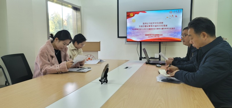 11月27日上午,国际教育学院直属党支部传达学习全省扎实推进繁荣兴盛的文化强省建设大会精神,全体支部党员参会,会议由学院党支部书记方宗保主持。