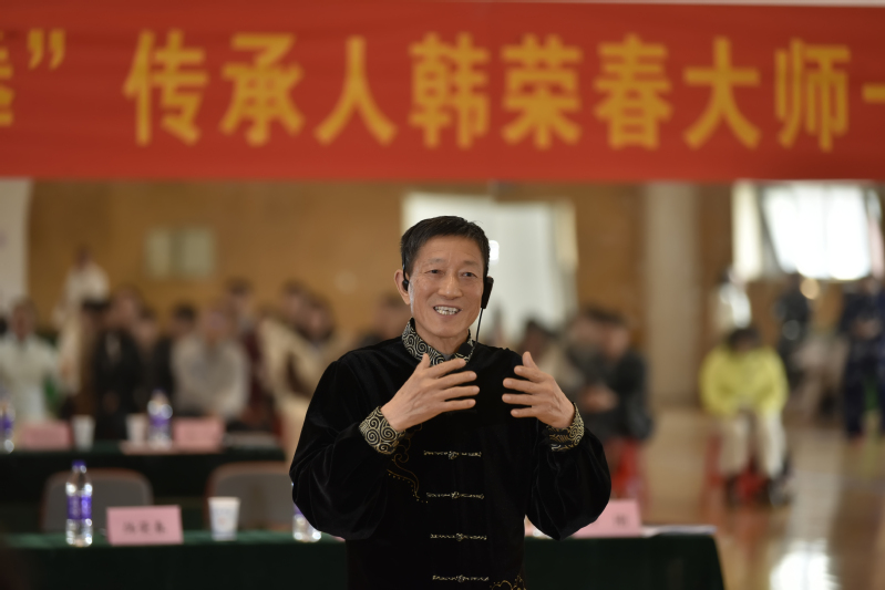 “阴阳双合拳”由元末明初武术家杨艺融合少林、武当之长所创,以中医经络学为基础,通过螺旋缠绕、牵拉拽引、敲击振穴等手法,疏通经络、平衡阴阳,兼具养生与技击功能。韩荣春身着玄色练功服登台,以“阴阳双合拳”起手式揭开序幕;伴随“气沉丹田,力贯四梢”的浑厚嗓音,向大家讲解了“阴阳双合拳”内练心意灵感气,外练神韵筋骨皮的特色内涵,并演示了“左右缠六经”“击海关”“震膻中”等经典动作。其拳法刚柔并济,如清风拂柳又似雷霆万钧,展现了少林拳的刚猛与武当太极的绵柔。韩荣春强调,“阴阳双合拳”不仅是武术,更是养生智慧的结晶。