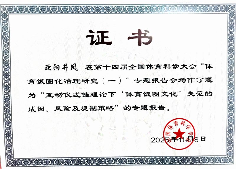 本届大会共收到论文投稿35833篇,录用10714篇,录用率为29.9%。录用形式涵盖专题报告(其中论文报告3810篇、案例交流331篇)、墙报交流5495篇以及书面交流1078篇。根据大会公布的录用结果,我部教师欧阳井凤的研究成果成功入选专题报告(论文报告)环节,该环节录用率不到11%。这一成绩充分体现了我部教师扎实的科研功底和前沿的学术视野,彰显了体育部科研创新能力的显著提升和学术活力的持续增强。