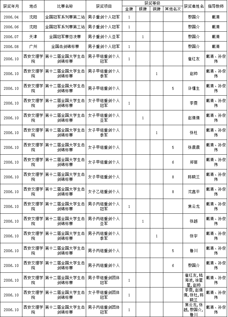 2006年合肥学院体育俱乐部改革指导学生获奖一览表
