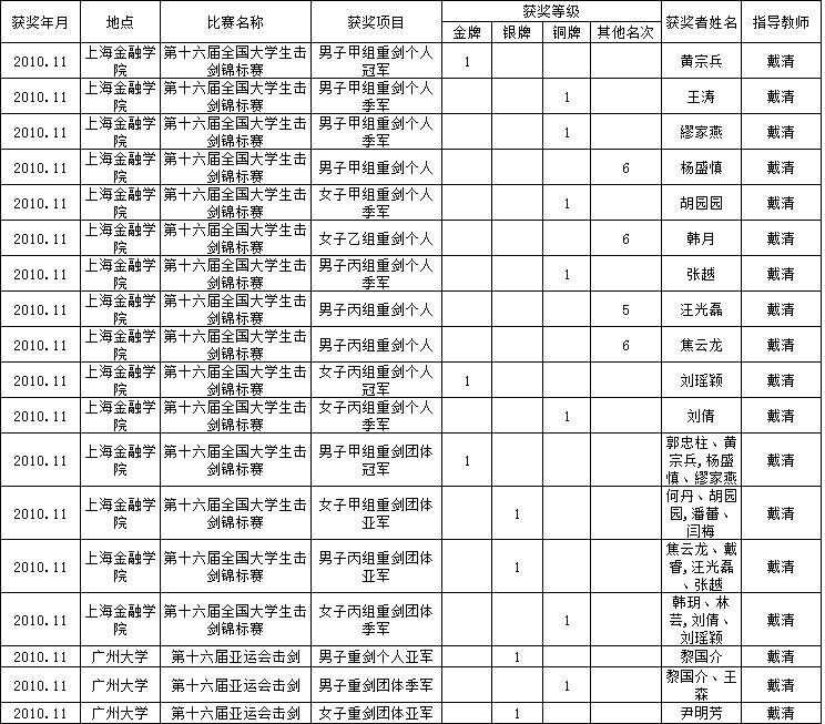 2010年合肥学院体育俱乐部改革指导学生获奖一览表