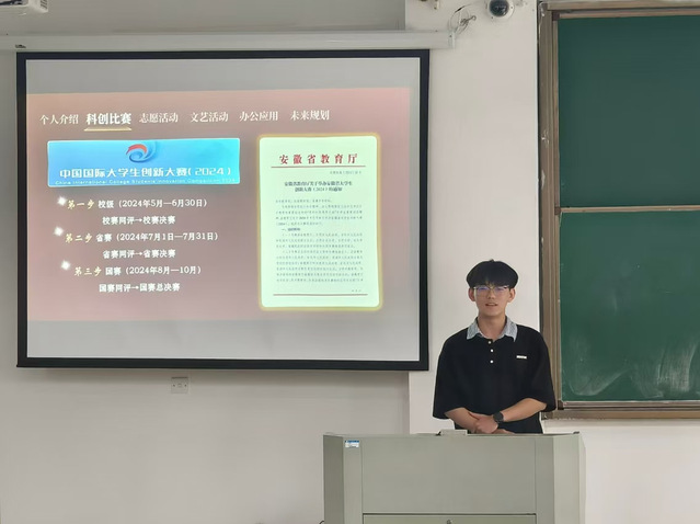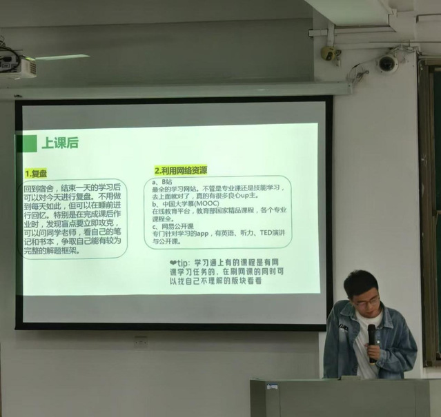 首先,由22级潘炳志学长发言。为了帮助新生有更高的生活质量,他分享在校大学生参加校内外实践锻炼的经验。他指出大学生活是一段充满挑战与机遇的旅程,它不仅仅是学习专业知识的地方,更是我们成长、锻炼和塑造自我的重要阶段。