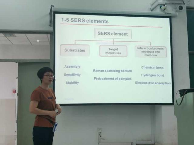 报告会伊始,吴义平副教授对SERS技术进行了解释,她分析了此技术的优势和应用领域,阐释了其工作原理,追踪了其研究进展和热点,也分析了此技术当前存在的不足和缺点。随后,她详细介绍了其小组在应用SERS技术检测有机污染物方面的研究。从选择可收缩和膨胀的高分子聚合物模板、合成可控修饰贵金属纳米粒子从而构筑可动态调节贵金属纳米粒子间隙的智能SERS基底,到利用此基底高灵敏检测常见的有机污染物包括染料、农药、食品添加剂、抗生素、塑化剂等分子,以及诠释其结合的其它表征技术和理论方法对研究进行的数据分析和机理探讨。最后,她为现场踊跃提问的各位同学答疑解惑。