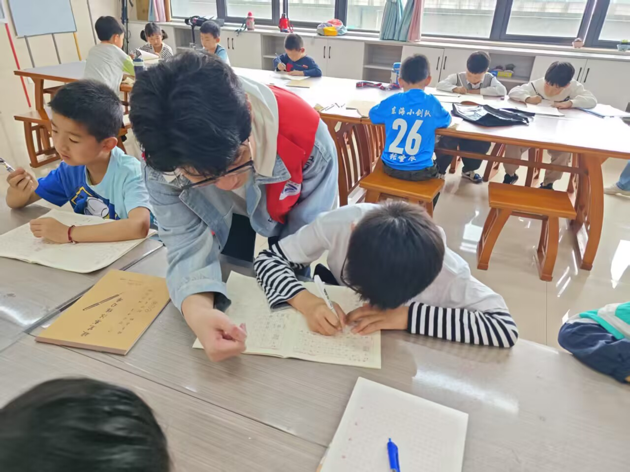 上午,志愿者们齐聚朝霞社区教室,认真地为孩子们进行签到,确保每位小朋友都能准时参与到活动中来。在随后的书法课堂上,他们积极协助老师维护课堂秩序,与正在学习书法的孩子们亲切交流,让整个书法课堂变得更加生动有趣,充满了欢声笑语。