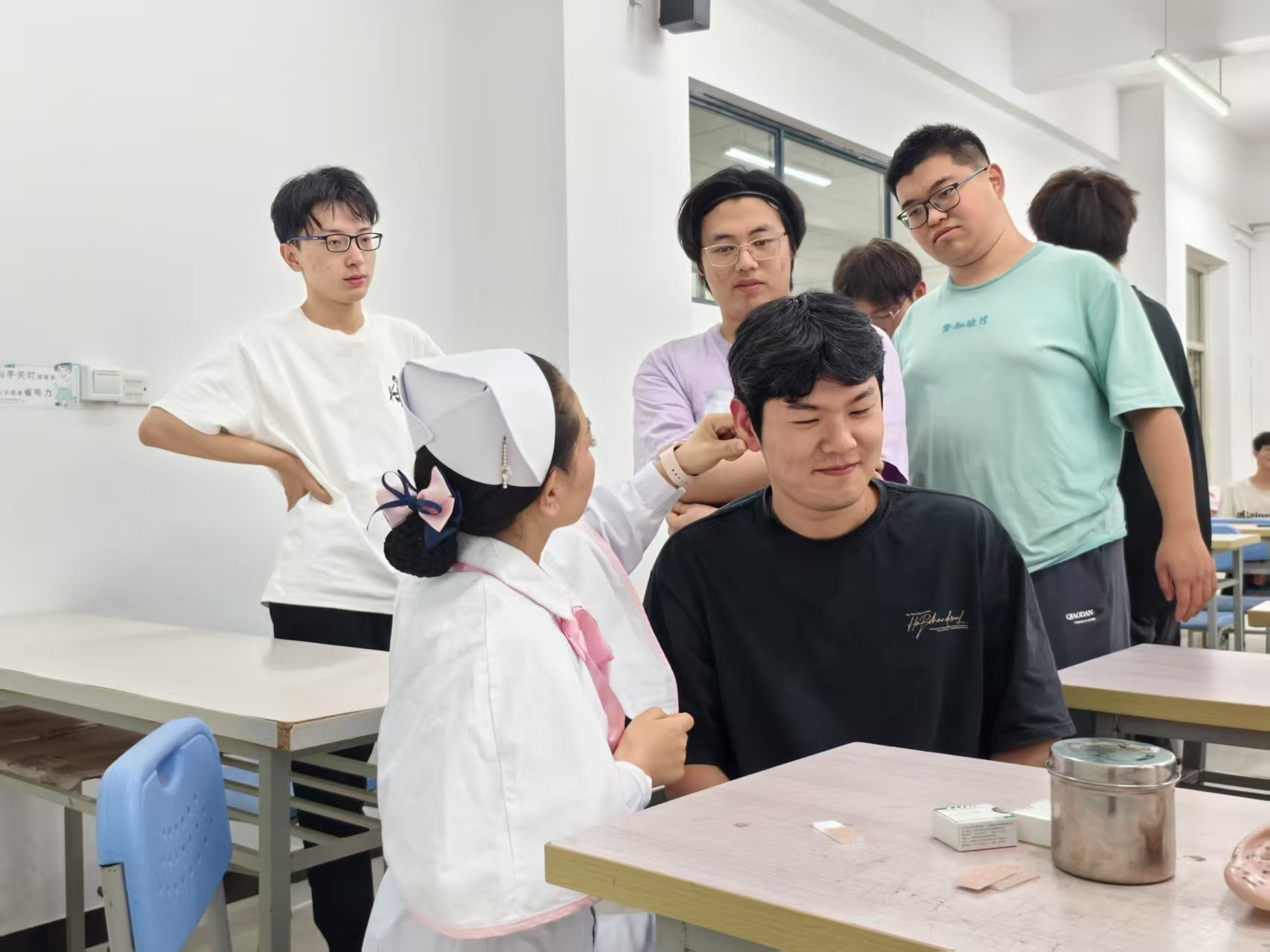 在讲解结束后,武老师还为在场的同学们进行了刮痧和耳穴贴压的实际操作演示。她一边操作,一边详细讲解每个步骤的注意事项和技巧,确保同学们能够掌握这些方法。通过亲身体验,同学们不仅加深了对中医护理治疗的理解,也感受到了其在情绪管理中的显著效果。