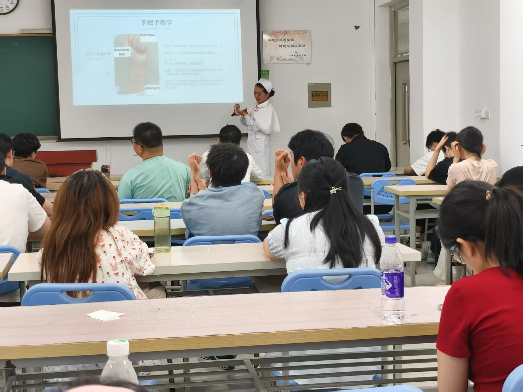 在讲座过程中,武老师特别强调了“手把手教学”的重要性。她通过图解和文字说明,详细介绍了足三里、合谷、太冲等穴位的自我按摩方法,以及拍八虚的拍打技巧。这些方法不仅简单易学,而且效果显著,能够帮助学生在日常生活中自我调节情绪,缓解压力。