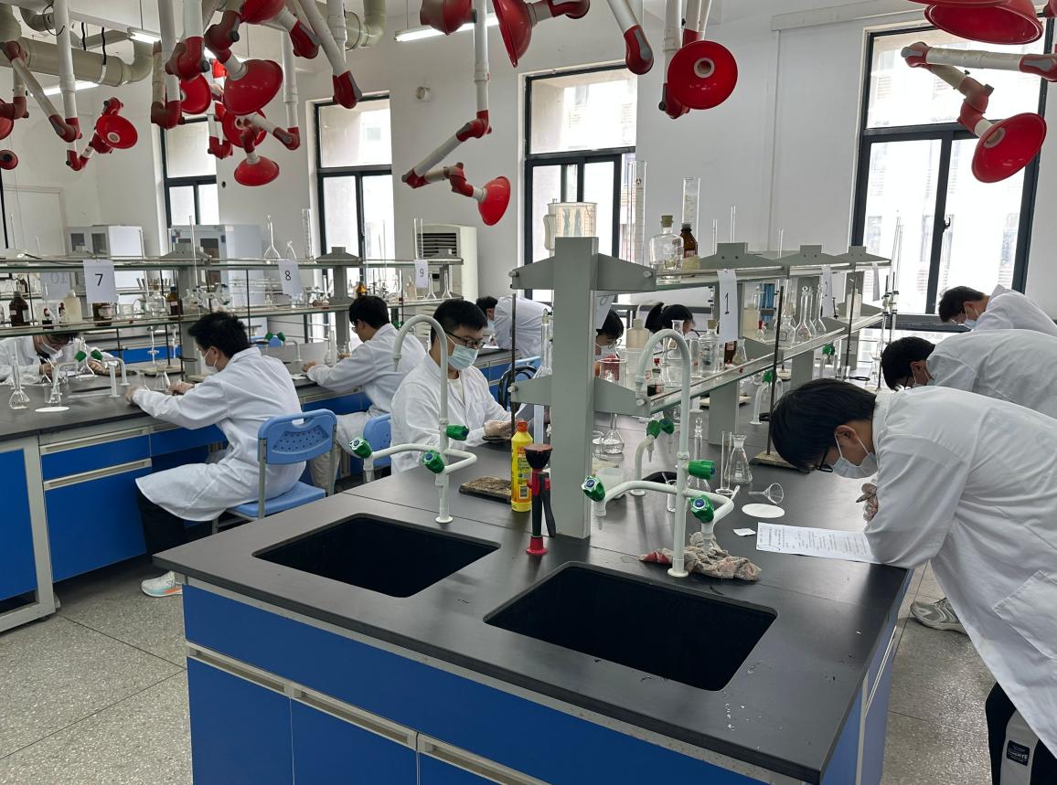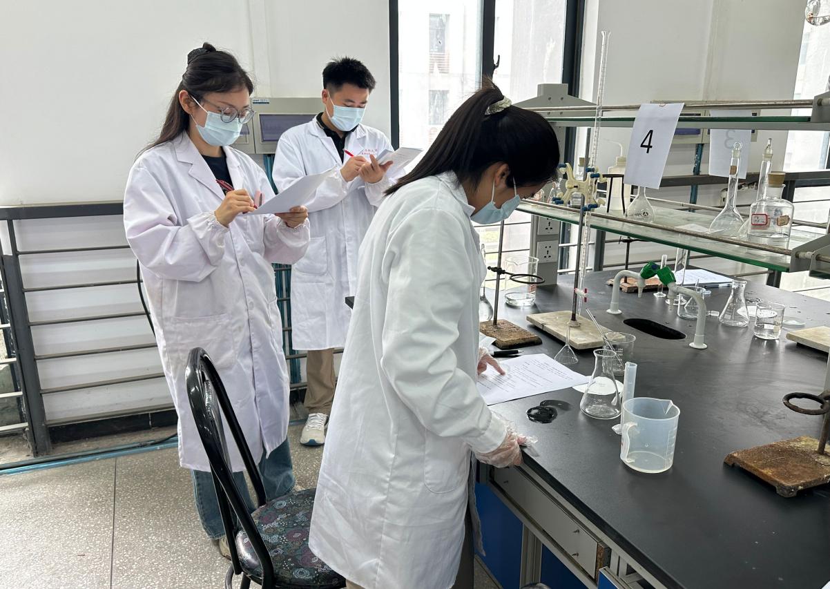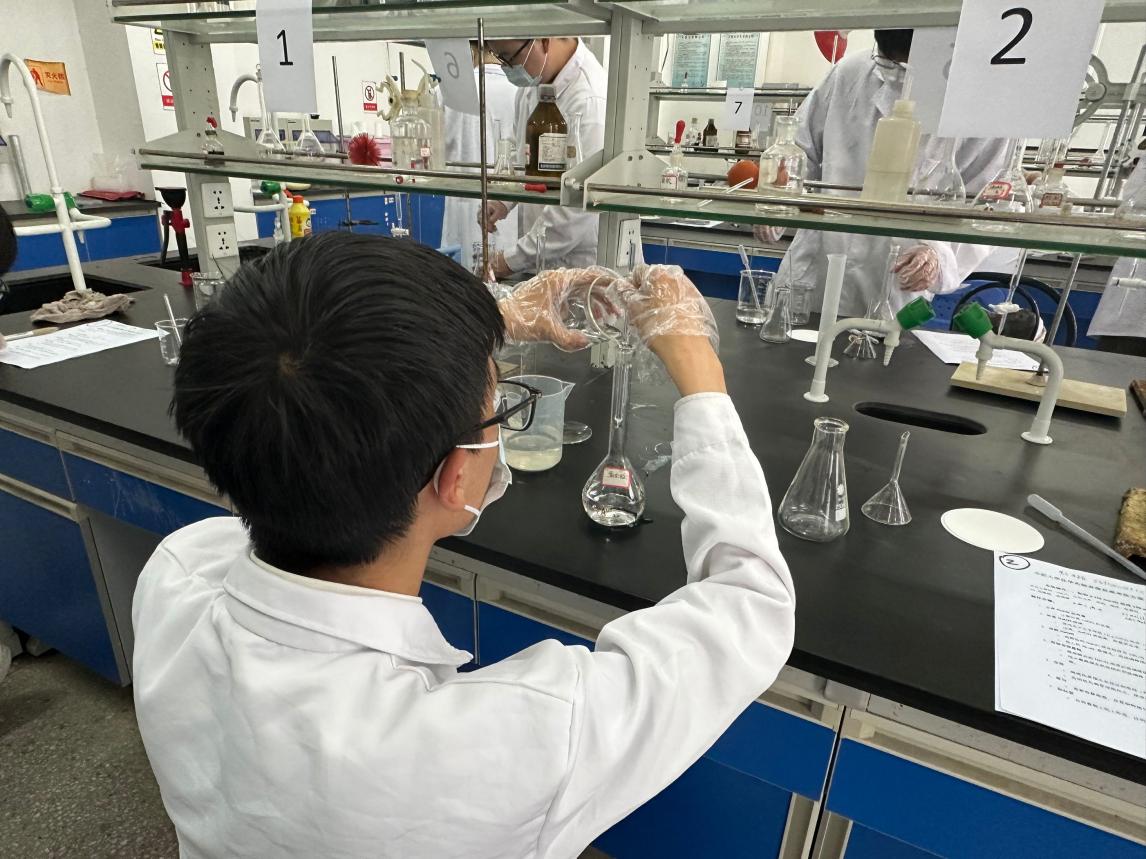 决赛为综合实践操作,实验环节从无机化学、分析化学、有机化学方面着重考察操作实验仪器、实验环节设计、实验数据记录与处理等能力。比赛过程中,参赛选手们独立思考,沉着冷静,认真进行实验操作,展现了积极向上的良好风貌,评委老师在一旁认真观察选手们的操作,保障实验的安全性与正确性。大家按照实验步骤有条不紊地进行着,称重、溶解、搅拌、定容,每一步都彰显着选手们的实验操作功底与实验环节的熟悉,举手投足间展现着他们的细致入微与严谨认真。