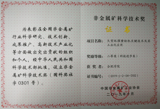 该团队与桂林鸿程矿山设备制造有限责任公司共同完成的《大型纵摆磨粉机关键技术及其工业化应用》项目获得科技进步类二等奖。这是我校首次获得该项奖励。
