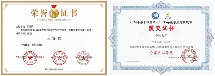 20244月,随着第十四届MathorCup数学应用挑战赛拉开序幕,张圣涛立刻踏上了早出晚归的备赛之路。他基于真实网络数据,利用数据驱动的智能PCI规划模型,以优化网络效率和用户满意度为目标,针对2067个小区进行智能化的PCI分配和优化的研究,利用遗传算法得到每一个子问题的最优解,从而实现了网络性能的最佳PCI分配。最终比赛历时4天,团队一路突出重围,以作品《基于遗传算法优化的多目标整数规划:小区PCI分配问题的研究》获得研究生组安徽赛区二等奖!在一次次比赛过程中,他不断积累与科研相关的大量实践经验,提升自身的专业素质,在青春的赛道上留下无悔的足迹。