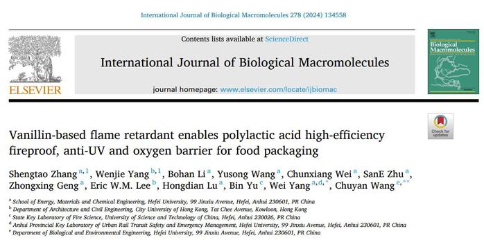张圣涛在科研道路上敢于挑战自我,收获颇丰。截至目前,他发表SCI论文4篇,以第一和共同第一作者发表SCI论文2篇。其中以生物质阻燃剂为研究方向的论文《Vanillin-based flame retardant enables polylactic acid high-efficiency fireproof, anti-UV and oxygen barrier for food packaging》发表在国际期刊《International Journal of Biological Macromolecules(IF=7.7)上,该研究以生物基原料香草醛采用简单的一步法合成一种生物基添加剂,用来在增强聚乳酸的整体性能,拓展了聚乳酸在多个领域的应用。