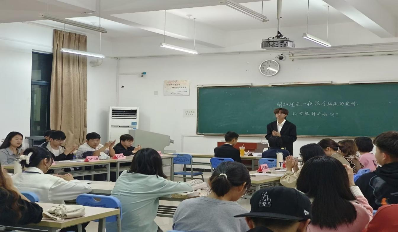 双方就“明知道是一段没有结果的爱情,你会选择开始吗?”这一辩题开始辩论。比赛开始,双方互相问好。正方台词式的自我介绍给我们留下了深刻的印象。紧接着正方一辩做立论陈词,正方观点为“选择开始这段感情”,他的陈述简洁且坚定己方观点。紧接着,反方发表他们的立论陈词。一瞬间双方摩擦出了浓浓的火药味,来到第二回合进行一对一攻辩,正方选手举出泰坦尼克号的例子,在资产阶级的压迫下,他们肯定没有好的结果,但是他们还是开始了他们的爱情。并且爱情最后还拯救了rose,让她活成了真正的自己。反方选手也不甘示弱。反驳道,这个爱情到最后rose到底是幸福多还是痛苦多呢?几个回合下来,双方打的有来有回,比赛现场更是令人激动。观众们不自觉地发出阵阵掌声。在最后的嘉宾提问环节里,无论是评委提出的问题还是现场观众提出的问题,我们的选手总能给出满意的答案。在评委们的仔细斟酌下,反方获得本场比赛的胜利,晋级决赛,最佳辩手为反方二辩。