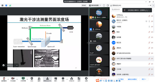 邓崇海副院长主持了本次线上学术报告会,首先对韩永生研究员表示热烈欢迎。韩永生研究员作了题为“材料表界面反应-传质调控与应用基础”的学术报告,重点阐述了材料表界面反应-传质调控策略、构效关系以及应用。报告最后,邓崇海副院长、研究生就关心的问题进行讨论。