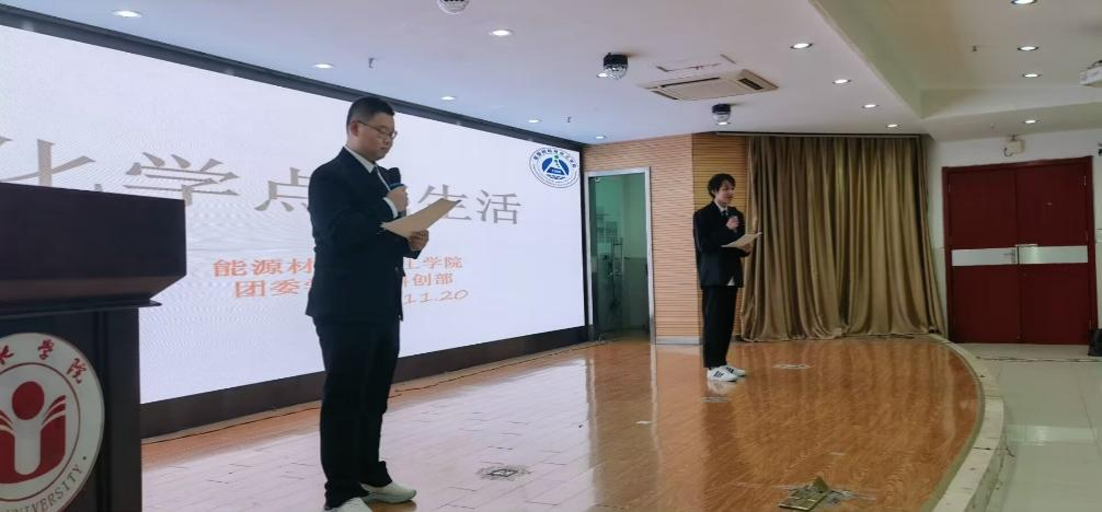 11月20日晚七点整,由能源材料与化工学院院学生会科创部主办,院学生会各部门协办的“化学点亮生活”大赛决赛在大学生活动中心报告厅拉开序幕。本次比赛由能源材料与化工学院主席团成员王振鑫、彭泽宇、魏嘉琪、朱海涛、张小辉担任评委。