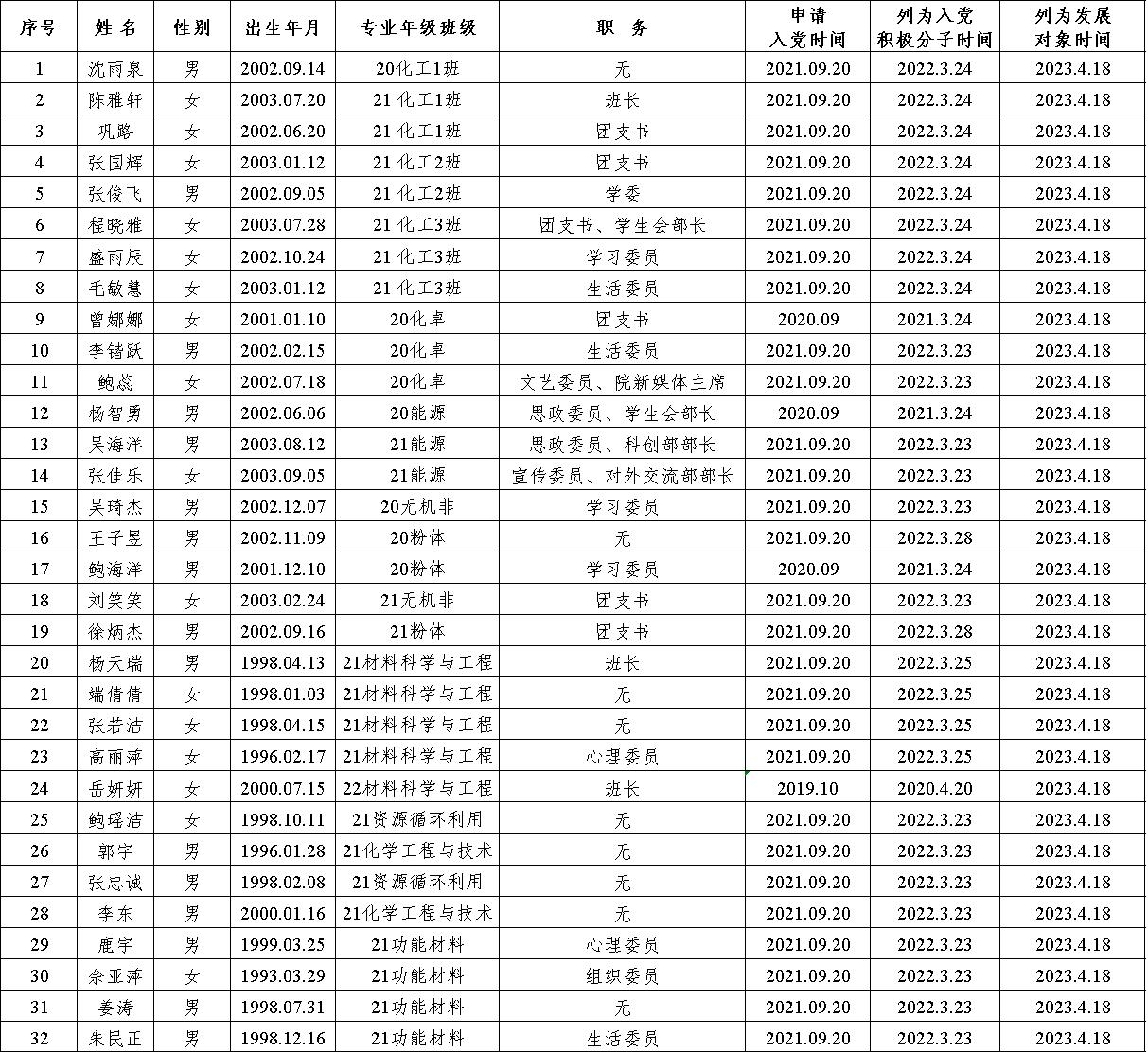 经支部委员会研究,报上级党委备案同意,将沈雨泉等32位同志列为发展对象,现将有关情况予以公示。公示期从2023年4月18日至2023年4月23日止。在公示期内,任何单位和个人均可采用电话、信函或直接来访的形式,向材化学院纪委反映沈雨泉等32位同志在政治立场、理想信念、思想品德、入党动机、工作表现、廉洁自律和遵纪守法等方面的情况,同时也可反映基层党组织在发展党员工作中坚持党员标准和发展党员工作程序等方面的情况。反映问题要求实事求是,客观公正。