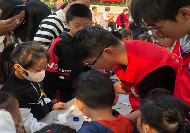 本次活动的首个环节是社区化学实验。在本环节中,志愿者们通过从实验室带来的化学实验装置与试剂,向居民们简单地展示了化学反应的基本原理和实验过程,旨在让大家在轻松愉快的氛围中了解有关化学的知识。例如,团队成员们使用靛蓝二磺酸钠、碘伏、维生素C等实验试剂以及烧杯等装置,为大家演示了变色碘伏实验,配置碘酒溶液、着色、研磨维生素C并进行最终反应,实验过程中不仅做到每一步都准确完成,更是在不停地讲解每一步所发生的化学反应原理,为什么烧杯中的溶液颜色会不停地变换,用通俗易懂的语言生动形象地描绘了奇妙多彩的化学世界,通过精心设计的实验项目,参与者将亲身体验化学反应的神奇魅力,增加了大家对科学的兴趣和认识。居民们对此表现出浓厚的兴趣,纷纷询问和探究,志愿者们也一一解答,使得居民们对化学实验有了更深入的了解。