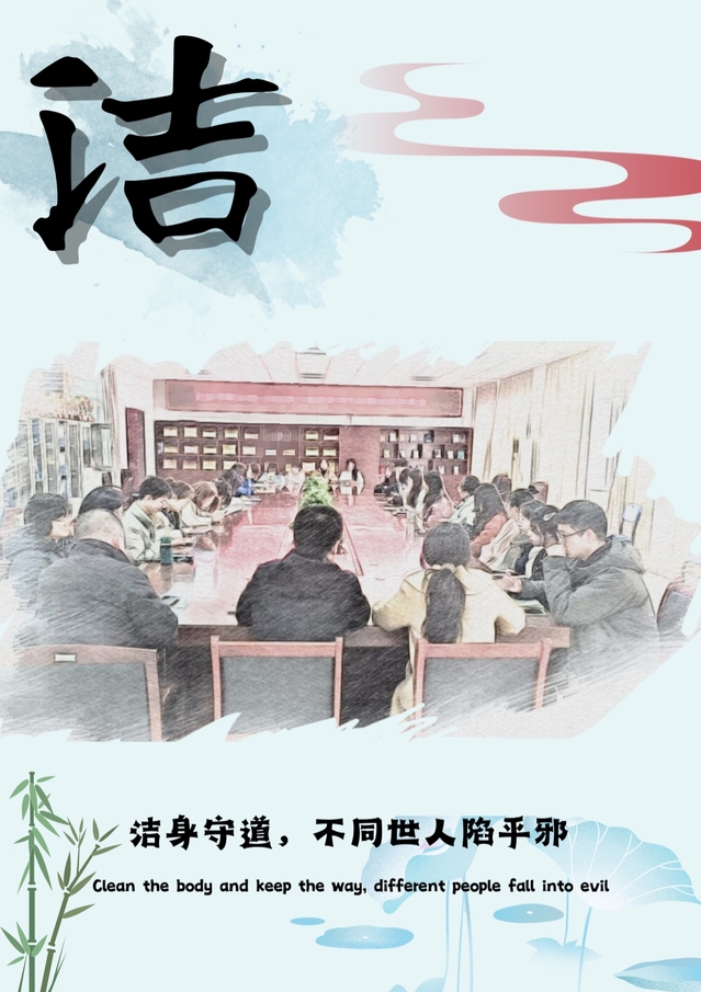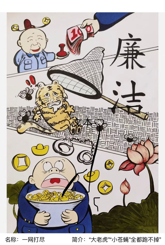 作品围绕“反腐廉洁”进行创作,运用了三位手工艺人的形象对贪污腐败的人进行反讽;将腐败不正之风的人不会有的生活方式直接写了出来,同时使用扁平画的风格将生活中最朴素人物的真实的状态表现出来,字体偏手写风格,充满亲和力,“廉洁”两字使用红色更加突出。