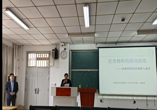 首先,院长江芳教授介绍了优秀校友代表程朋军的基本情况,程朋军是合肥市长江路第三小学兰亭分校校长,并代表学院对程朋军出席此次交流表示热烈的欢迎,也希望程朋军校长对学院建设和发展提出宝贵建议,共同将学院建设得更加美好。