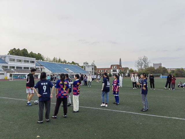 比赛前,各位参赛球员做好了充分的赛前准备后,在裁判一声令下,激烈的比赛便拉开了帷幕。比赛刚开始时,双方都打得比较保守,处于试探性阶段。随着双方对对方球风的了解,比赛开始激烈起来,双方球员也渐入佳境,不时打出精妙的配合和有威胁的射门。双方毫不相让,不断地进攻、防守,你来我往,精彩纷呈。场外学生也激情洋溢,纵情地为队员们加油、叫好,现场气氛十分热烈。虽然天气已经开始转凉,但每个球员毫不示弱,尽情展示团队的热情与默契。场上时时发起观众连连欢呼叫好声。足球场就在比赛进行中一点点升温,感染着在场的每一个人,最终我院以1:1和经济与管理学院打平。
